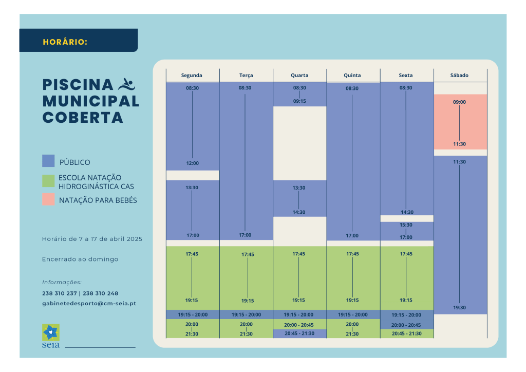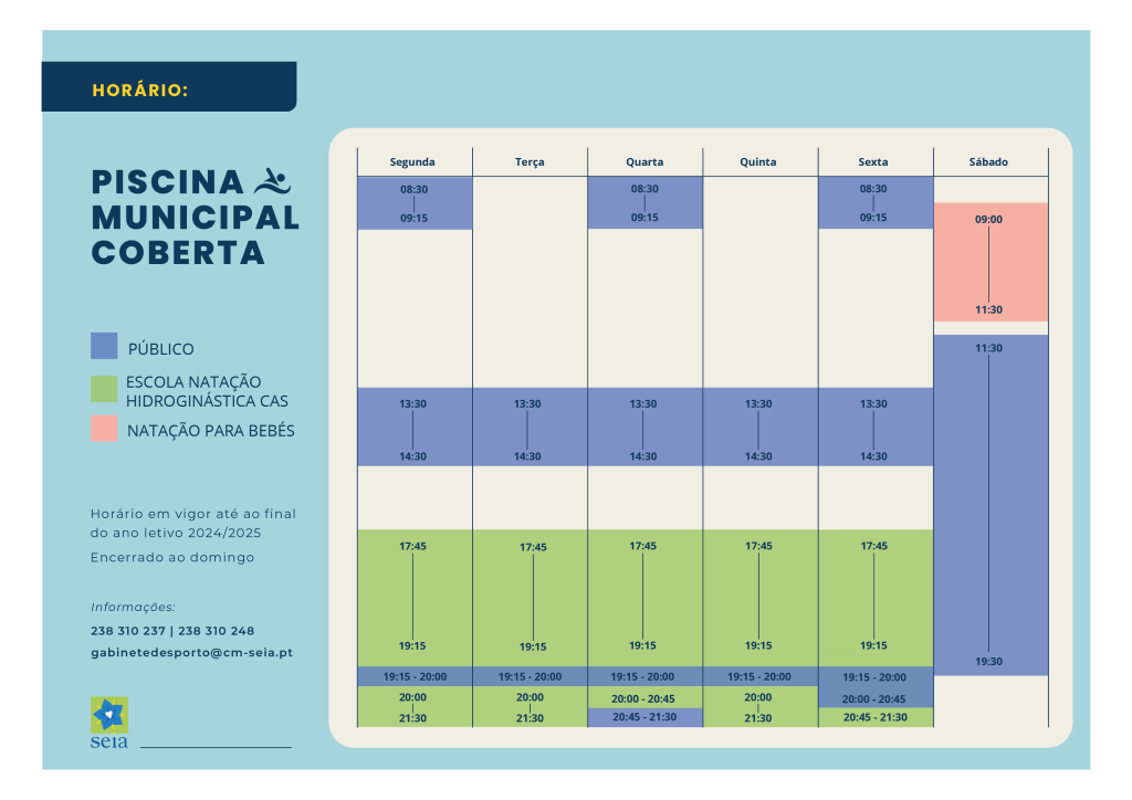 Verificar disponibilidade junto dos serviços municipais (telefone: 238 310 248 / e-mail: andredesporto@cm-seia.pt; gabinetedesporto@cm-seia.pt).