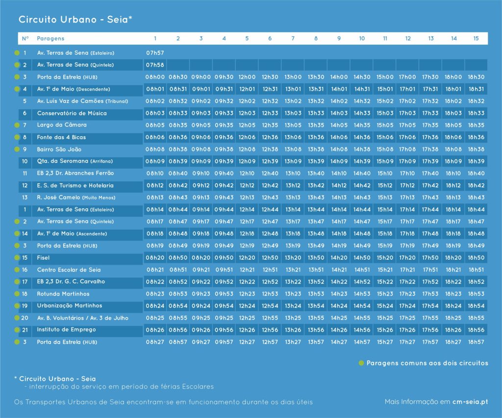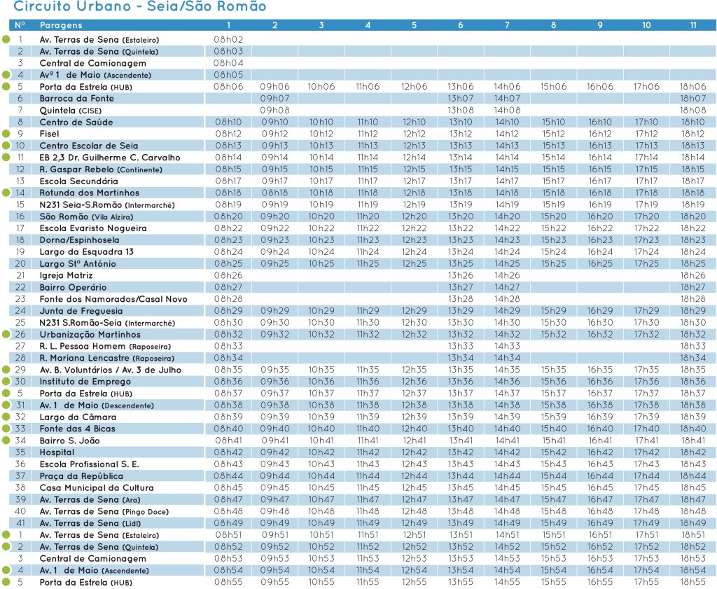 O autocarro urbano efetua o trajeto dentro da cidade e em São Romão, das 08h02 às 18:40h, passando 11 vezes em cada uma das 45 paragens em funcionamento.